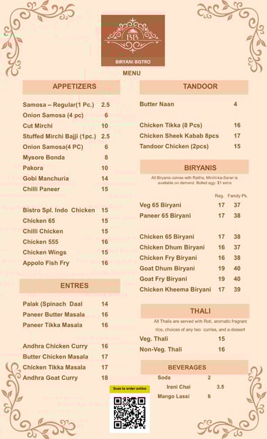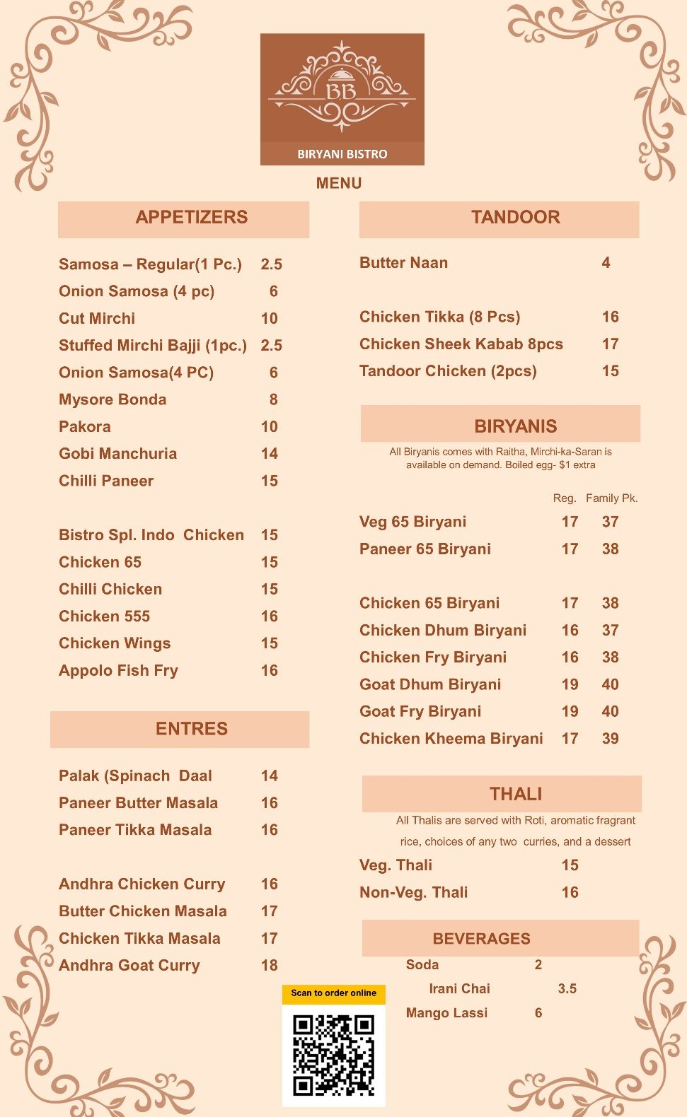 We're committed to your privacy. BIRYANI BISTRO uses the information you provide to us to contact you about our relevant content, products, and services. You may unsubscribe from these communications at any time. For more information, check out our Privacy Policy.